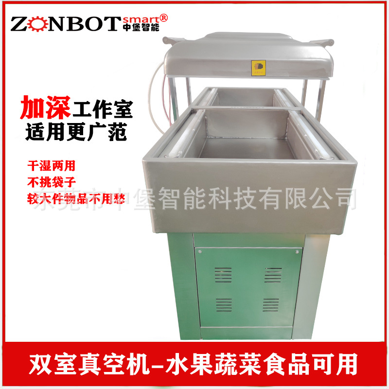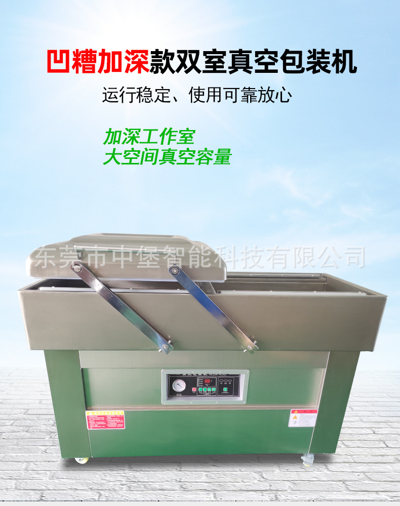 - 雙室凹槽真空包裝機(jī):凹槽設(shè)計(jì)使其對(duì)各種形狀和大小的產(chǎn)品包裝有更好的適應(yīng)性。對(duì)于不規(guī)則形狀的產(chǎn)品,如塊狀的肉類、海鮮,以及小尺寸的電子元件等,凹槽可以固定產(chǎn)品和包裝袋,確保抽真空和封口的效果。而且它可以同時(shí)處理不同形狀和大小的產(chǎn)品,只要選擇合適的包裝袋和凹槽。