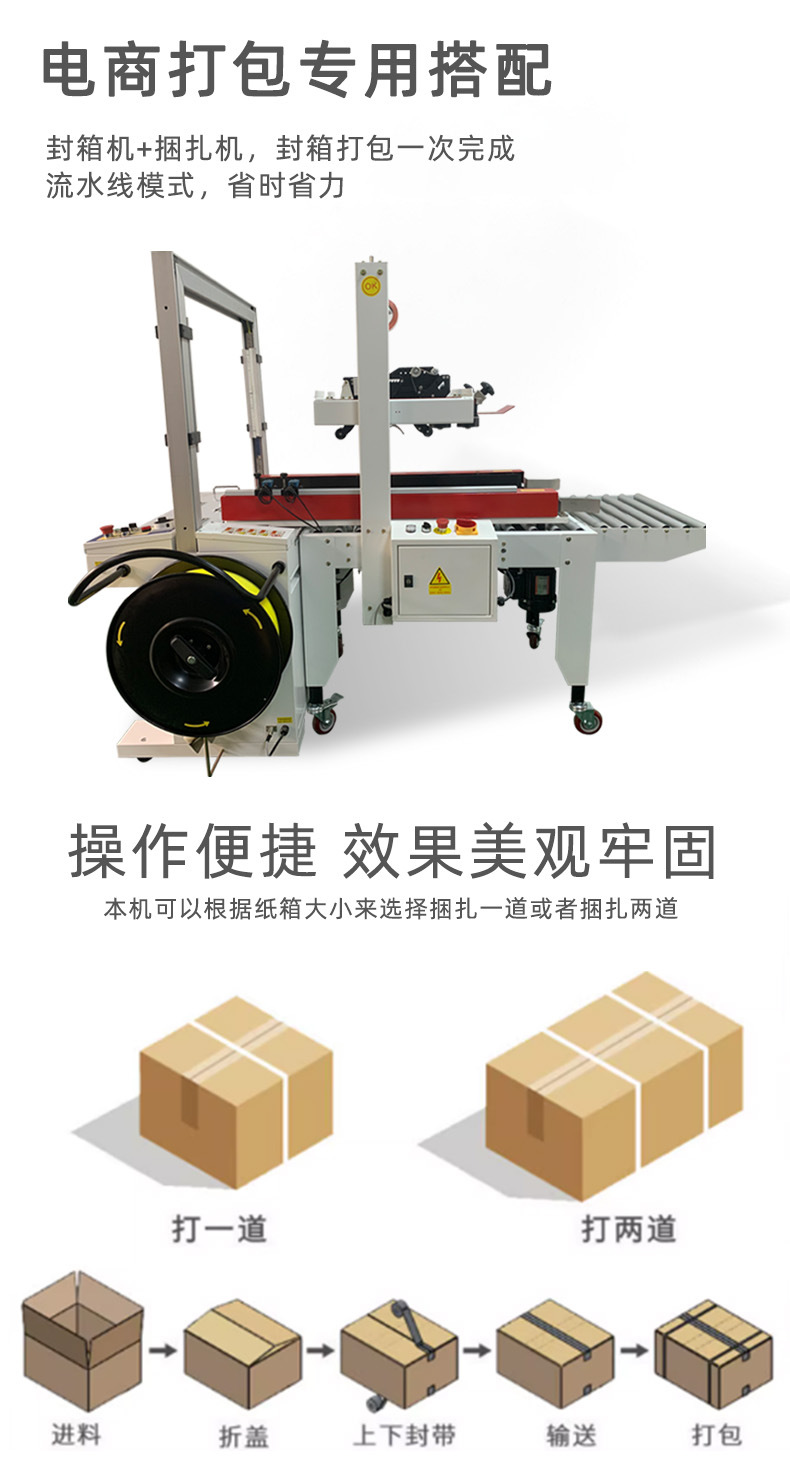 - 電商行業:在電商倉庫中,大量的商品需要進行包裝發貨。封箱打包一體機可以快速地對各種尺寸的快遞紙箱進行封箱和打包,提高發貨效率,適應電商行業快速周轉的特點。