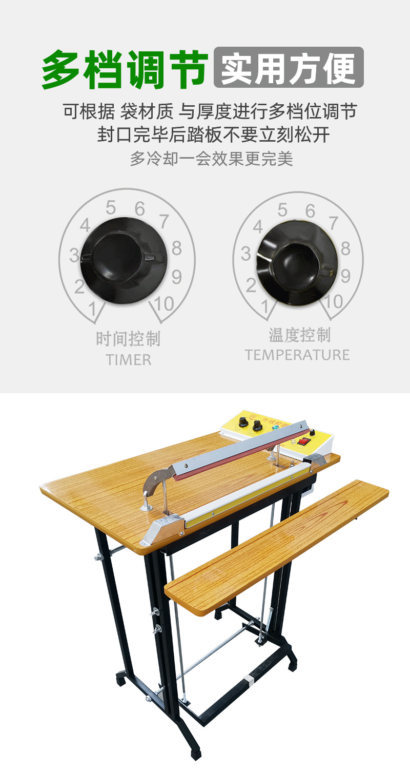- 封口質量穩定:盡管腳踏封口機的結構相對簡單,但它能夠提供穩定的封口質量。通過合理調節加熱溫度和壓力(通常在機器上有相應的調節旋鈕),可以對不同材質和厚度的包裝材料進行有效封口。例如,對于常見的塑料薄膜包裝,只要設置好合適的溫度和壓力,就能夠獲得牢固的封口,密封性能良好,能夠滿足一般產品的包裝需求。