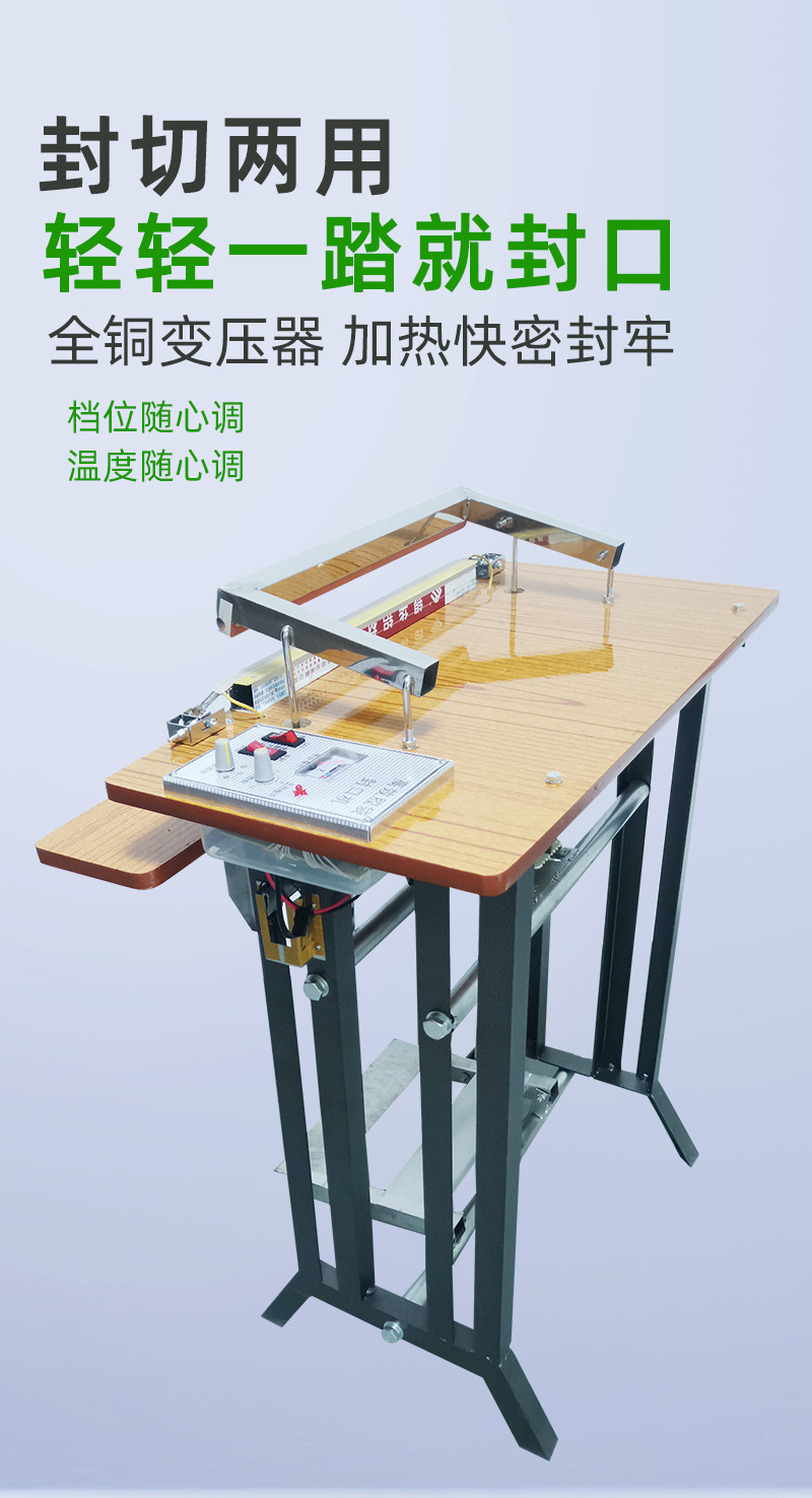 - 操作簡單方便:通過腳踏方式控制封口動(dòng)作,操作直觀、容易掌握。不需要復(fù)雜的電氣控制知識(shí),操作人員可以快速上手。這種簡單的操作方式尤其適合小型企業(yè)、商鋪或家庭作坊等對包裝設(shè)備操作要求不高的場所。