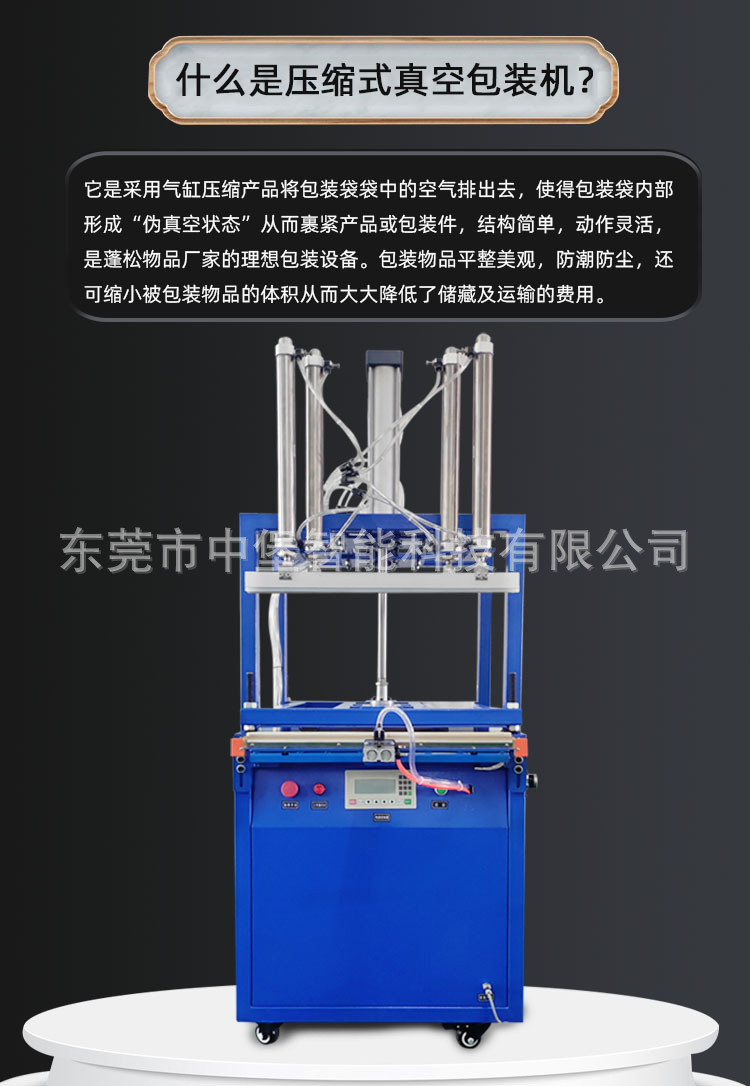 真空壓縮包裝機是一種能夠將包裝容器內的空氣抽出,使物品在低氧或無氧環境下被緊密包裝的設備。