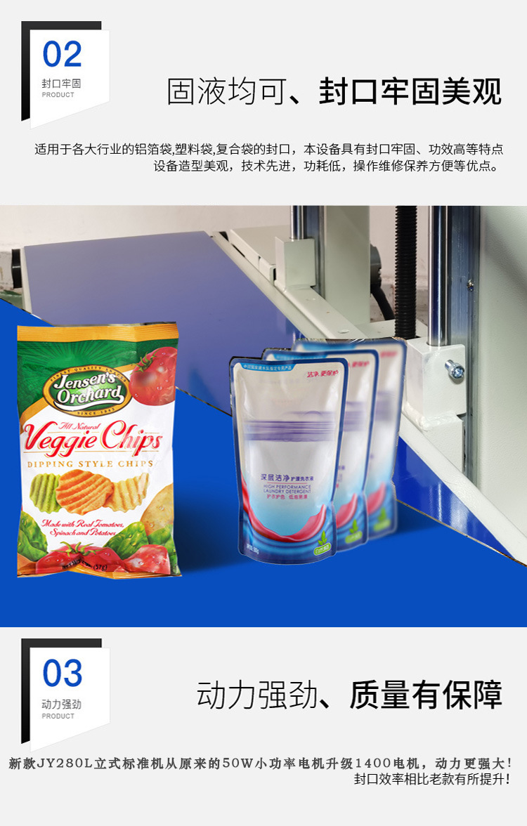 - 穩定的封口質量:精準的溫度調控、均勻施壓的封口壓頭以及穩定傳動,讓封口處平整光滑、密封性絕佳,可有效保障各類產品在儲存運輸中的完整性,減少因包裝問題導致的損耗。