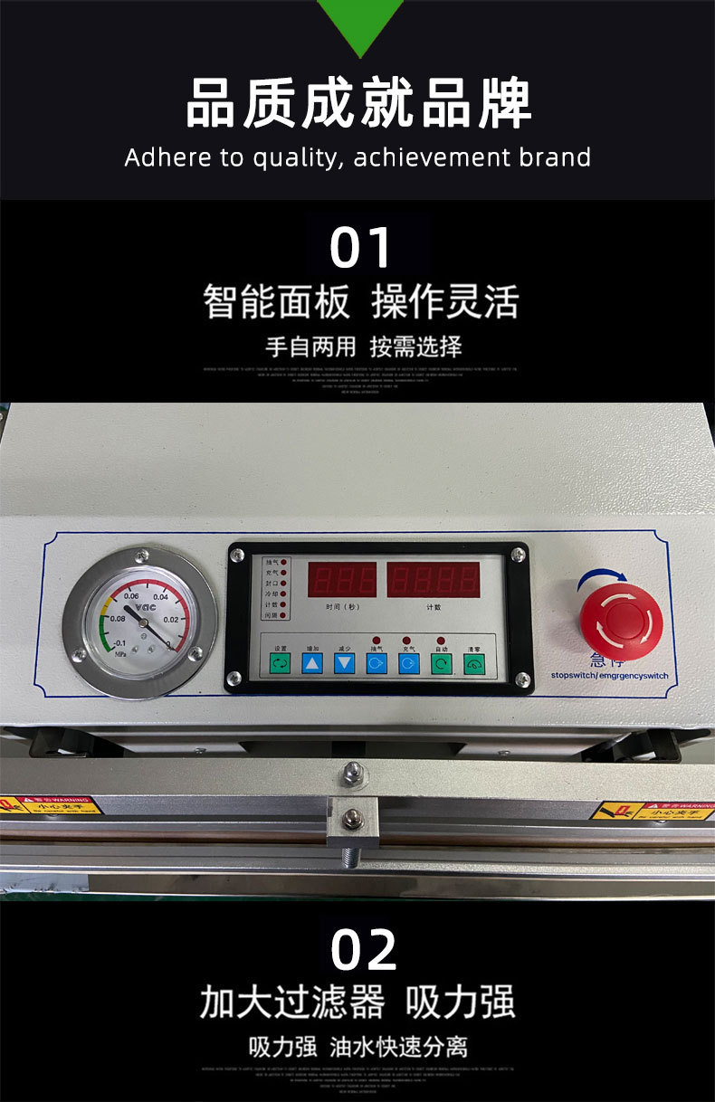 - 內抽式真空包裝機:將產品放入真空室內,關閉真空室門后,真空泵抽出真空室內的空氣,使包裝容器內達到預定的真空度,然后進行熱封合,完成包裝過程。