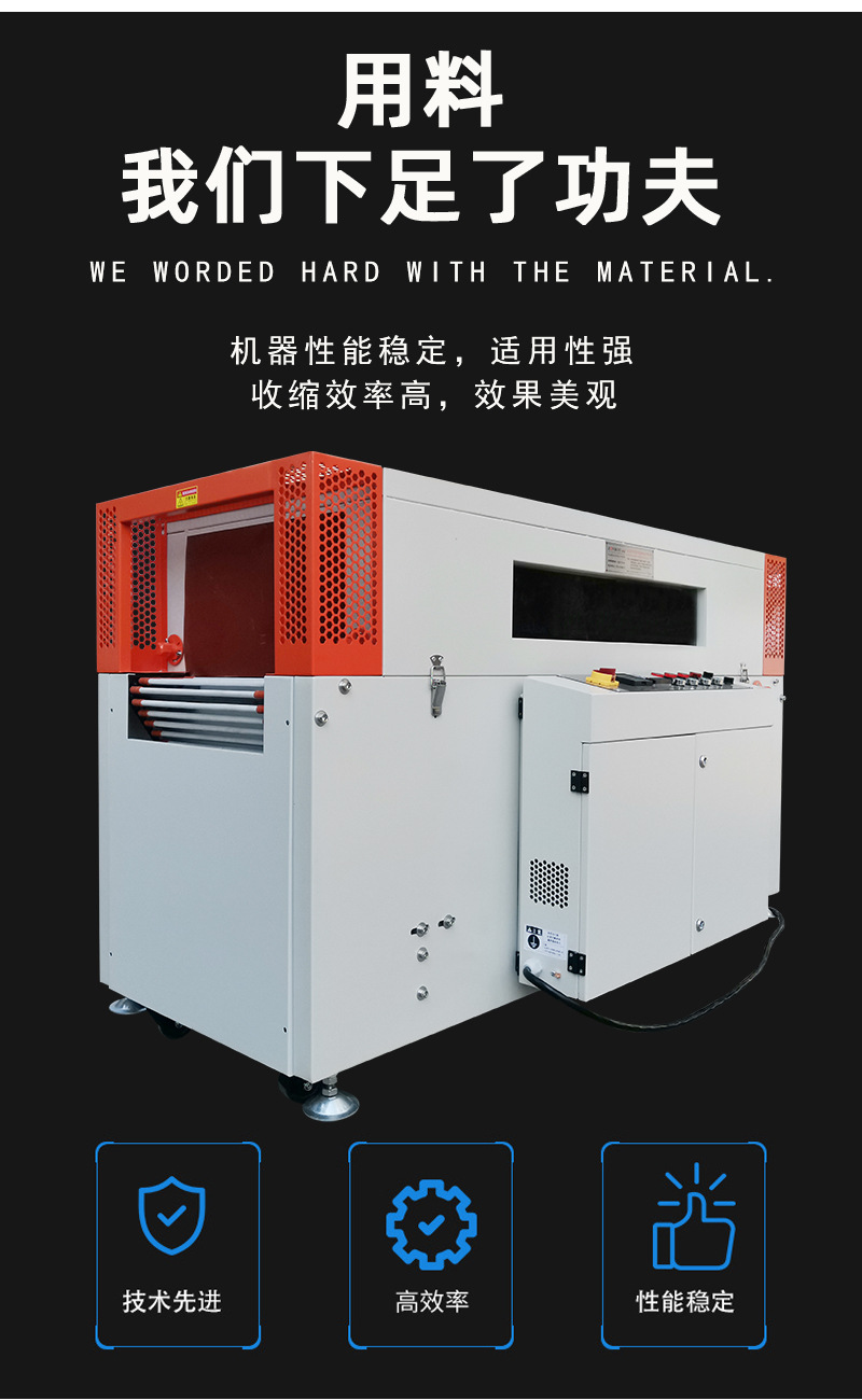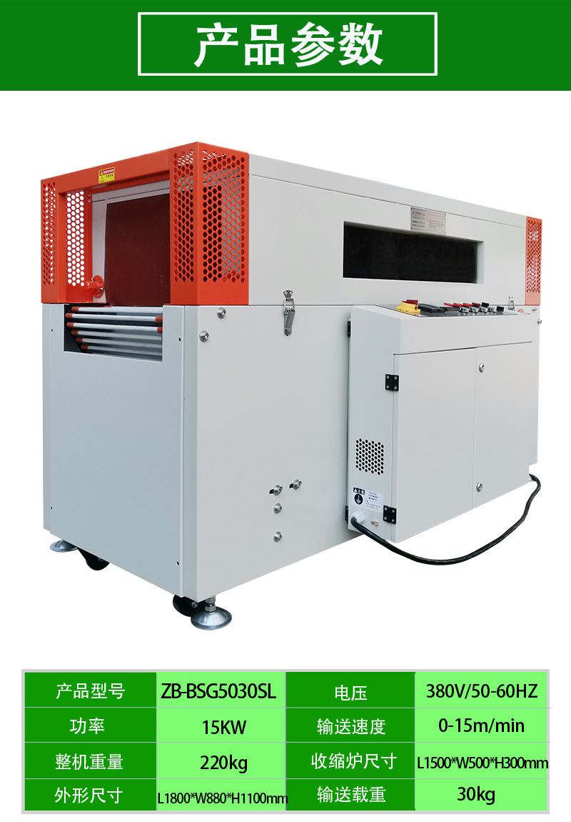 ZB-BSG5030SL熱收縮機是通過加熱裝置將熱收縮薄膜加熱至一定溫度,使其軟化并收縮,緊密地包裹在產品表面,從而實現(xiàn)對產品的包裝
