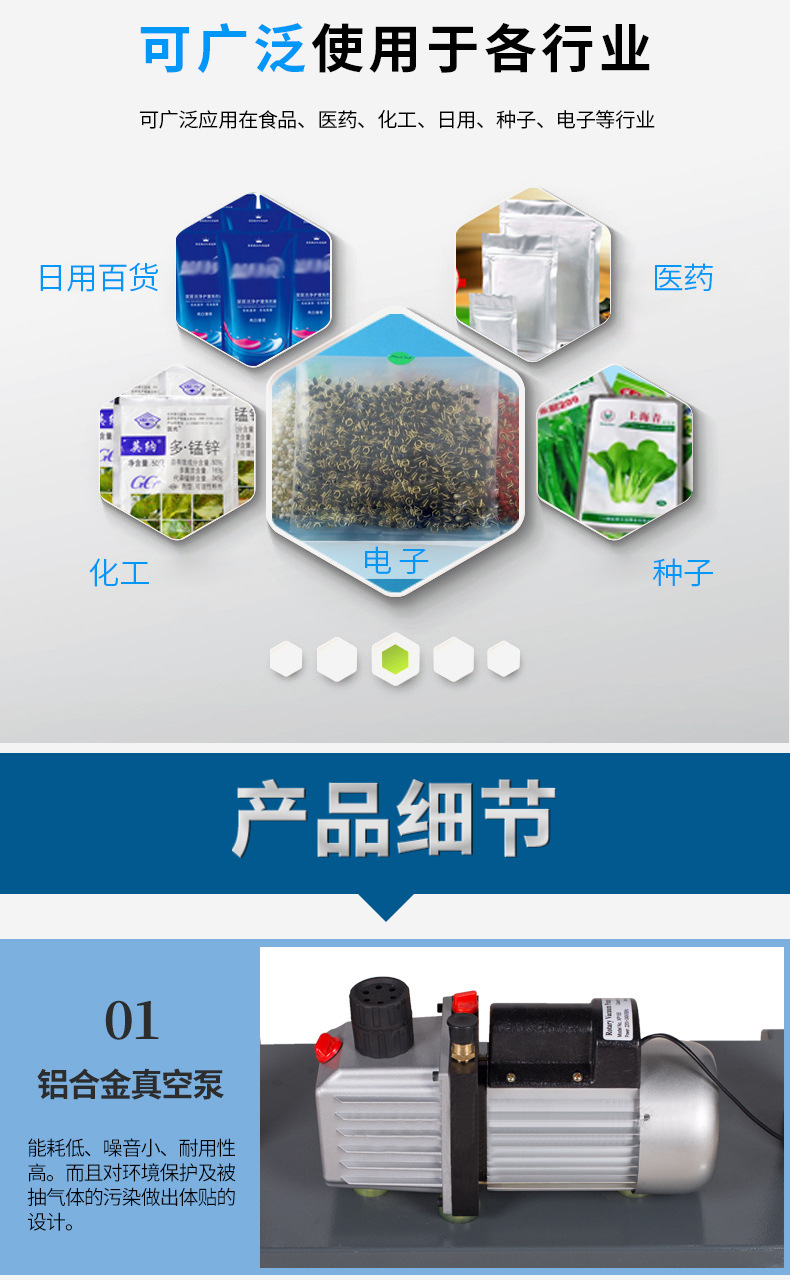 - 可以包裝電子元器件、小型五金工具等。通過(guò)真空包裝,保護(hù)產(chǎn)品免受濕氣、灰塵和氧化的影響,提高產(chǎn)品的質(zhì)量和使用壽命。