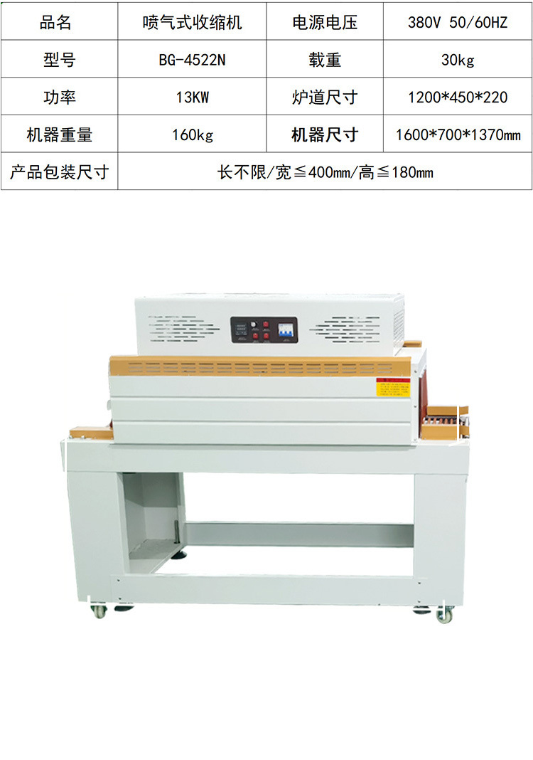 3. 收縮處理:完成封切的產品接著被送入熱收縮通道,熱收縮通道內裝有加熱裝置,多為不銹鋼加熱管,能釋放出穩定熱量。熱收縮膜接觸熱量后,分子間距縮小,產生收縮效應,緊緊貼合在產品表面,實現全方位、無縫的包裹,賦予產品良好的密封性與防護性。最后經冷卻段自然冷卻,包裝好的產品從出料口送出。