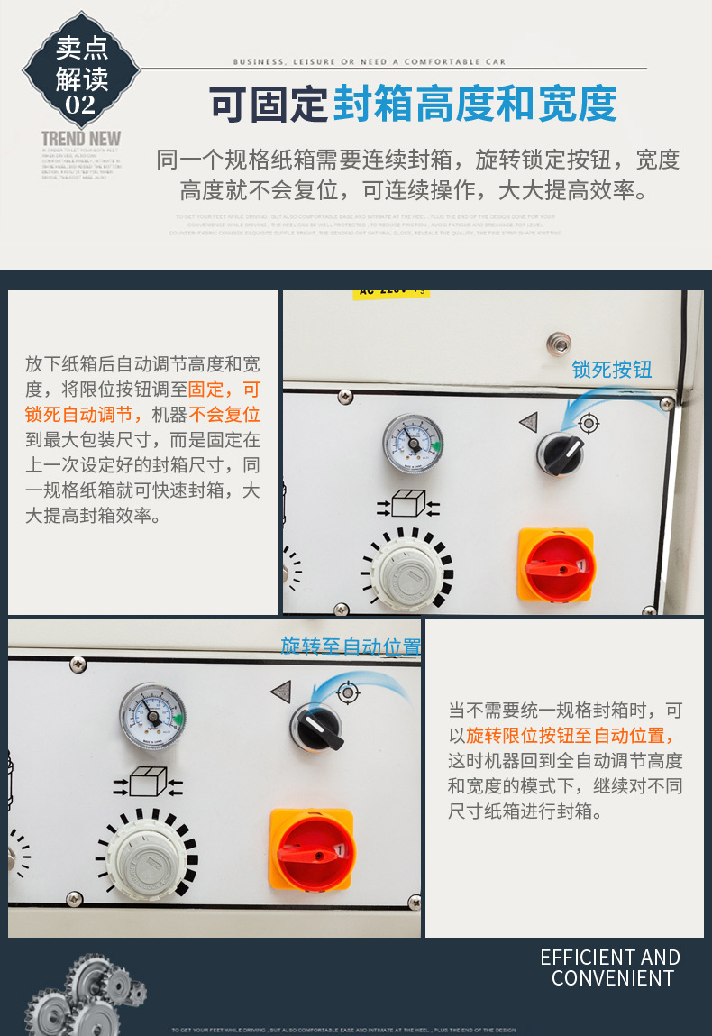 - 封箱操作:折蓋完成后,封箱機的封箱機構開始工作。如果是膠帶封箱,膠帶分配器會自動拉出一定長度的膠帶,并將其粘貼在紙箱的封口處,然后通過滾輪或壓輥等裝置將膠帶撫平,確保膠帶與紙箱表面緊密貼合,完成封箱操作。如果是膠水封箱,膠水泵會將適量的膠水涂抹在紙箱的折頁上,然后通過機械裝置將紙箱的蓋子折合,使膠水發揮粘合作用,實現封箱