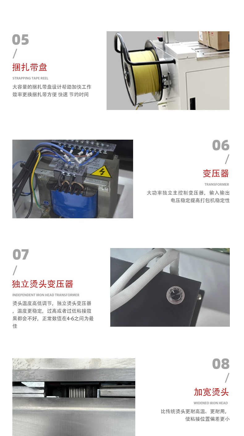 - 半自動打包機:效率相對較低,因為人工放置打包帶的過程會占用一定時間,且在連續打包時,人工操作的速度有限,更適合于打包量較小、對打包速度要求不高的場合,如小型企業、商鋪或家庭使用。