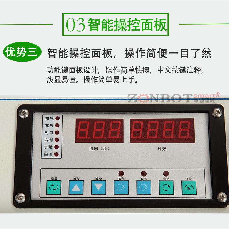 - 對控制面板參數進行調試,根據真空物品來調試真空時間、封口溫度、冷卻時間。