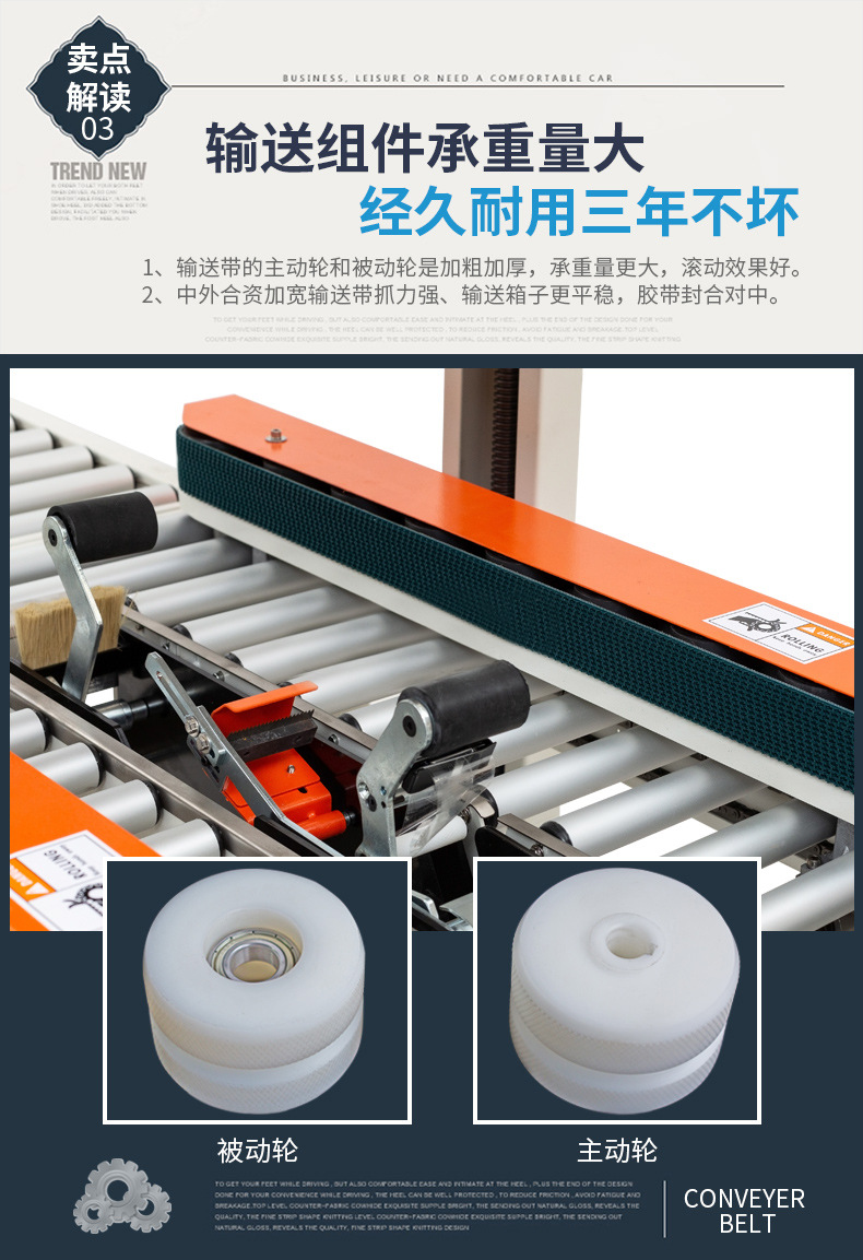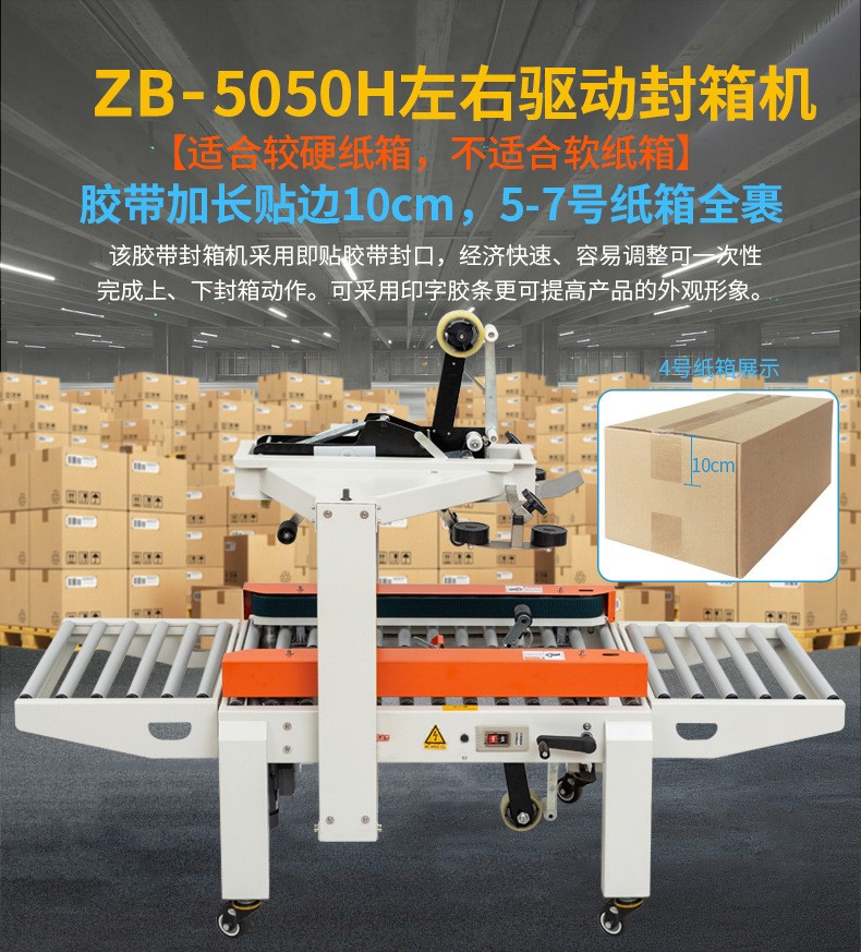 紙箱自動封箱機具有廣泛的用途,適用于家用電器、紡織、食品、日用百貨、藥品、輕工、化工等各種行業產品包裝、紙箱的封箱,可單獨封箱作業,亦可與充填、捆包配套成流流水線使用,為包裝標準流水線作業所必需的設備。 自動調整不同規格的紙箱高度與寬度。 側邊驅動式自動校正調整、送箱、運轉平穩