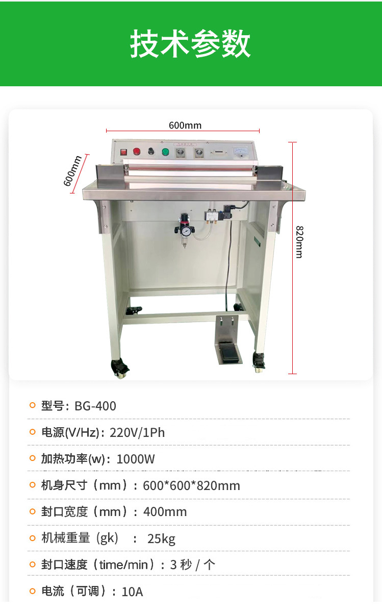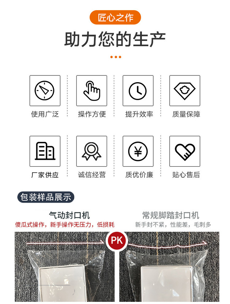 機器采用的是不銹鋼材料制成,利用壓縮空氣作為動力,封口的壓力可以進行調(diào)試,根據(jù)產(chǎn)品的不同選擇合適的壓力指數(shù)。設(shè)備穩(wěn)定可靠,可以手動操作也可以腳踏操作,簡單方便。