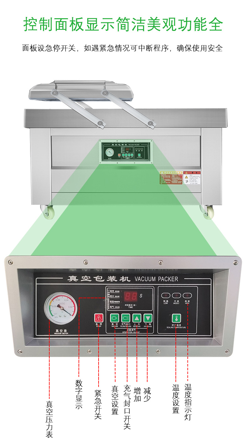 雙室真空包裝機是一種包裝設備,其主要功能包括真空包裝和充氣包裝。這種設備通過將包裝袋內的空氣抽出,達到預定真空度后完成封口工序,從而實現食品和其他商品的防腐、保質、防潮、防霉、防銹、防蝕、防蟲、防污染等目的