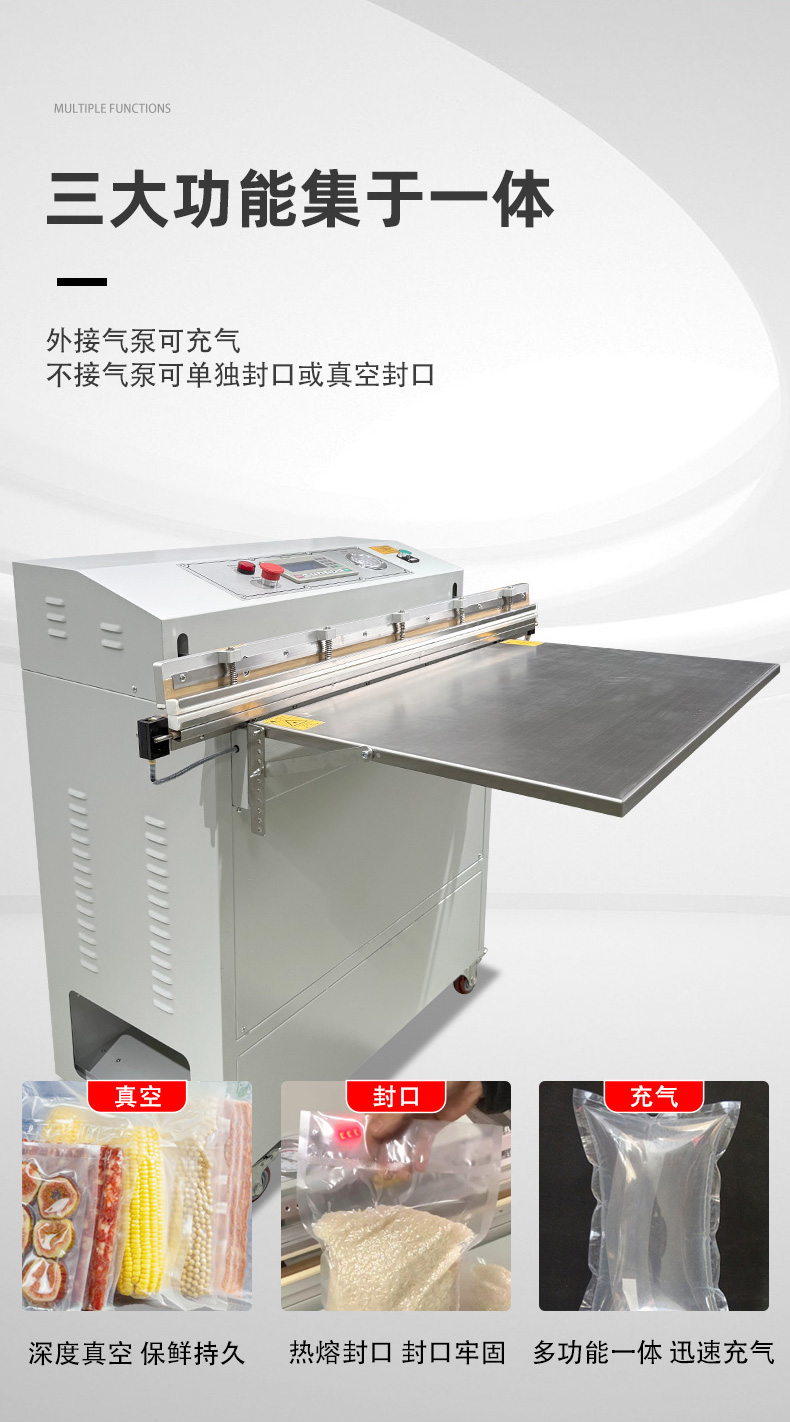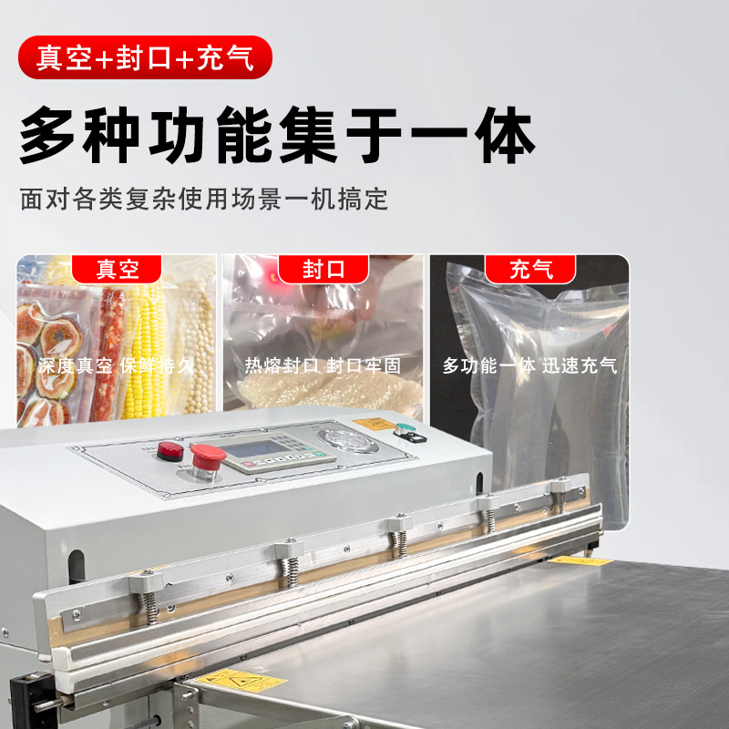 - 適配多場景:支持 PE、PA、鋁箔等多種包裝材料,可切換 “真空封口”“充氣保鮮” 兩種模式,兼顧工業防銹與食品保鮮需求。